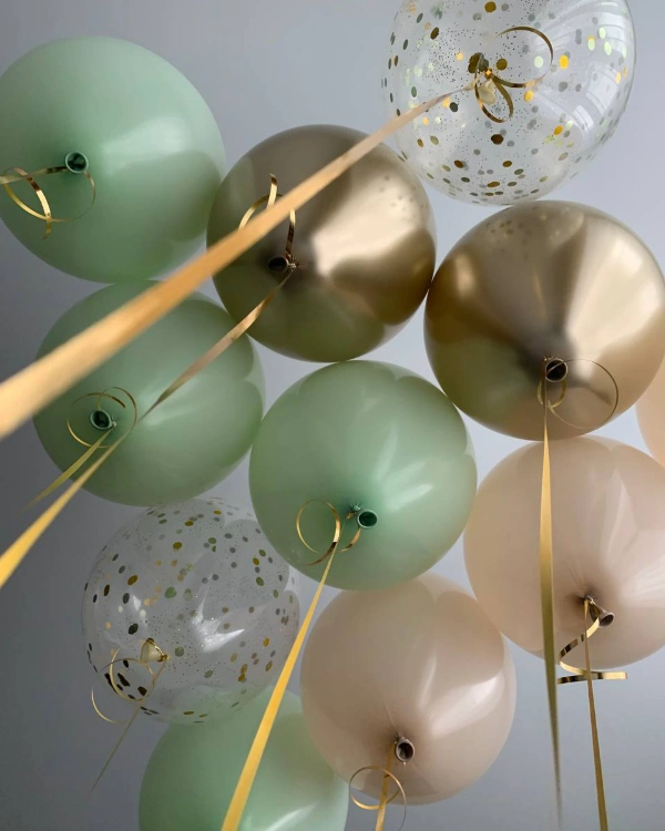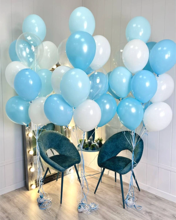 Оформить комнату малыша можно шариками в потолок. Оригинально и современно будет смотреться подборка из хромированных синих шаров в сочетании с серебром и серыми шарами агатами. Также хромированные синие шарики разбавляются золотыми и прозрачными шарами с конфетти. Вариантов оформления может быть огромное множество. Всё зависит от предпочтений покупателя.